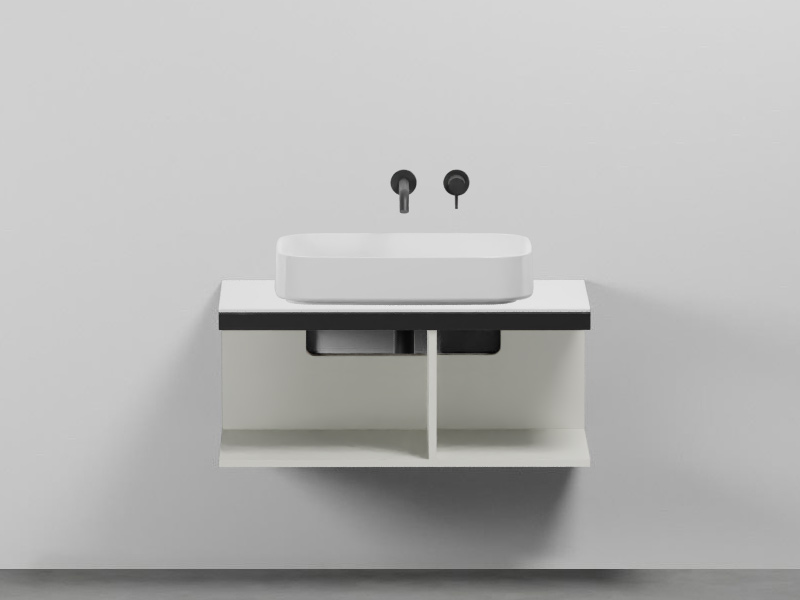 CIELO MULTIPLO MUMBC90NM Тумба под раковину подвесная с открытыми полками в цвете Pomice c структурой из стали в черном цвете. Обязательное сочетание тумба MUMBG90CM или MUMBG90NM + столешница керамическая MUPI90.
