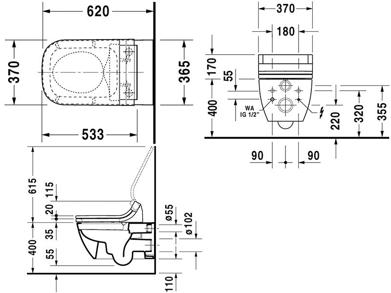 HAPPY D.2 Унитаз подвесной, с вертикальным смывом,только в сочетании SensoWash, включая компоненты для скрытого подключения, размер 36,5х62 см, цвет белый