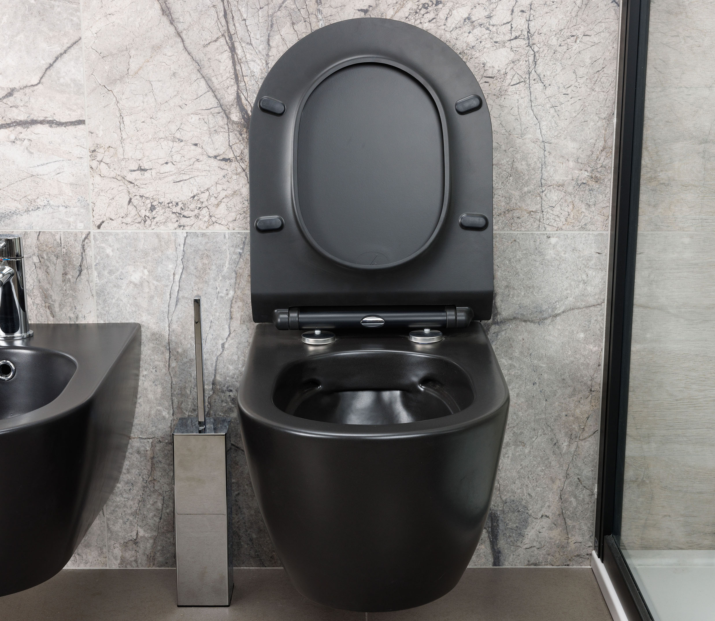 Унитаз подвесной безободковый HATRIA FUSION A1Y1CC02, без сиденья, без боковых отверстий, в комплекте с креплениями. Размер 35.5х54 см, цвет черный матовый. Крышка сидение приобретается отдельно.