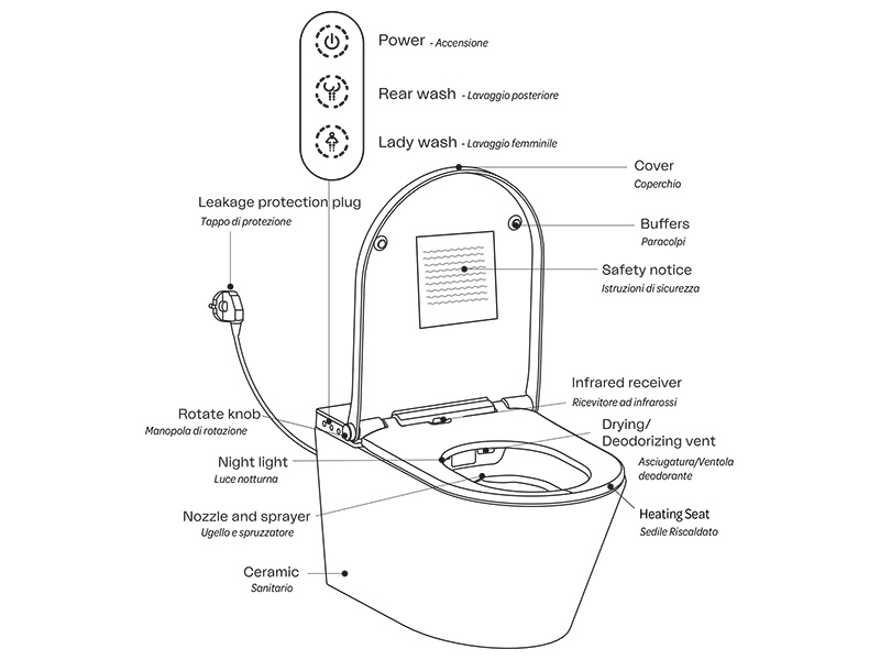 Умный подвесной унитаз компактных размеров (59 см) артикул Y9D301. Помимо классических гигиенических функций с возможностью регулировки интенсивности и температуры водной струи, модель обеспечивает сушку теплым воздухом и дезодорацию. Сидение с подогревом также имеет встроенную подсветку для использования унитаза в ночное время. Модель полностью автоматизирована и все функции управляются с помощью удобного пульта дистанционного управления или с боковой панели.