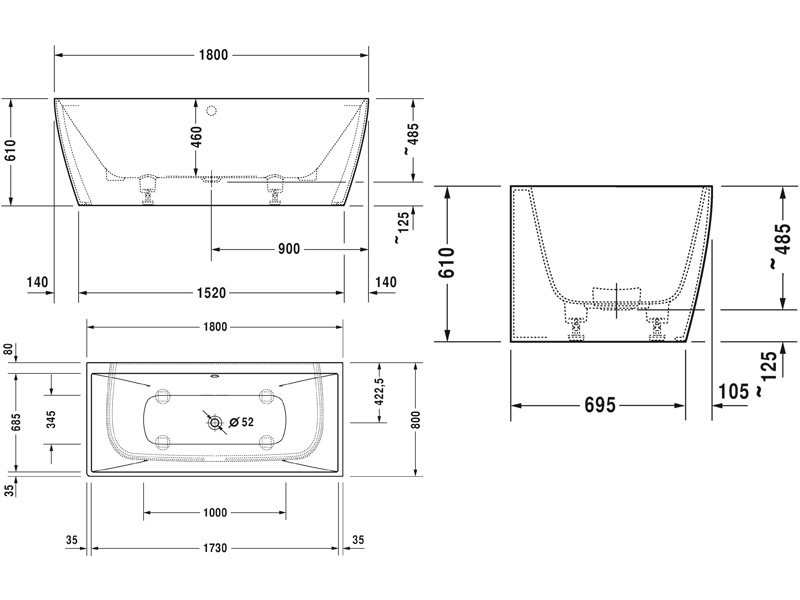 DuraSquare Ванна пристенная 180х80 , с бешовной панелью и ножками, из материала Durasolid