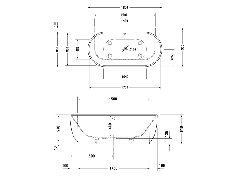 LUV Ванна пристенный вариант, с бесшовной панелью и ножками, с двумя наклонами для спины, размер 180x95 см белая