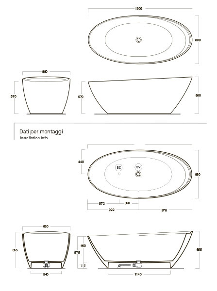 Ванна SIMAS BO V1 из Crystal Tech, укомплектована стоком с сифоном, размер 190x88x66 см, цвет белый.