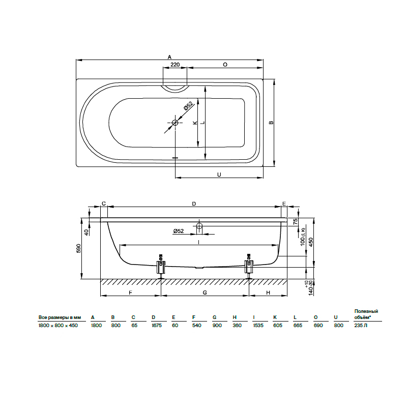 BETTEOCEAN ванна встраиваемая, сторона ног справа, перелив спереди 180x80x45Н см, цвет - белый,с покрытием BetteGlaze Plus