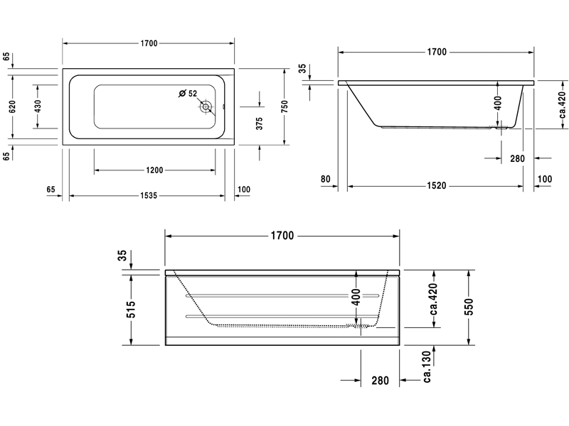 D-CODE Ванна прямоугольная, встраиваемый вариант, выпуск в зоне ног, размер 170 x 75 х 42 см, 4 мм санитарный акрил, цвет белый