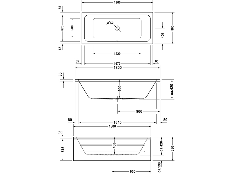 D-CODE Ванна прямоугольная, встраиваемый вариант, центральный выпуск, размер 180 x 80 х 42 см, 4 мм санитарный акрил, цвет белый