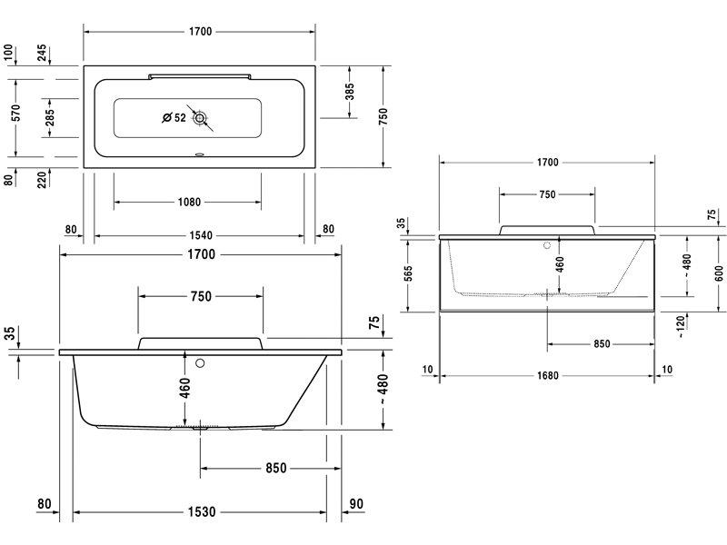 DURASTYLE Ванна прямоугольная, встраиваемый вариант или для панелей,с наклоном спины справа размер 170 x 75 х 46 см, 5 мм санитарный акрил, цвет белый