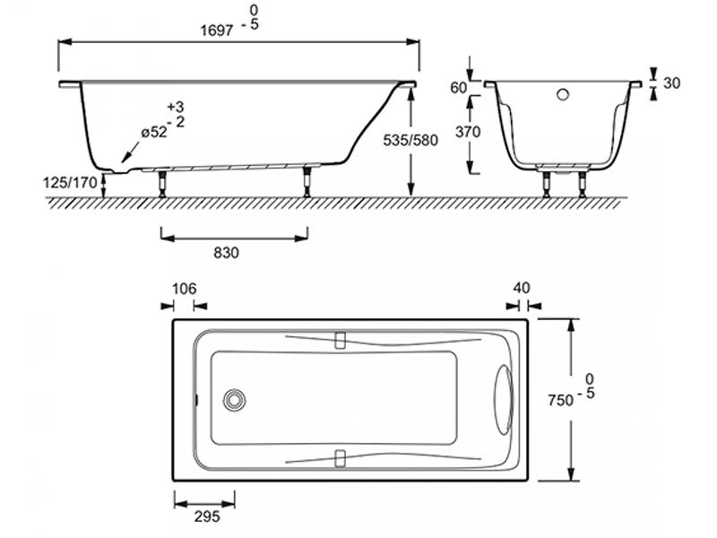 Встраиваемая акриловая ванна E60491RU-00 ODEON UP JACOB DELAFON имеет габариты 170 x 75x 42 см . Цвет белый.