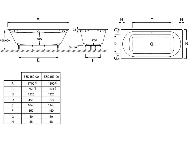 Ванна имеет прямоугольную форму и следующие габариты: