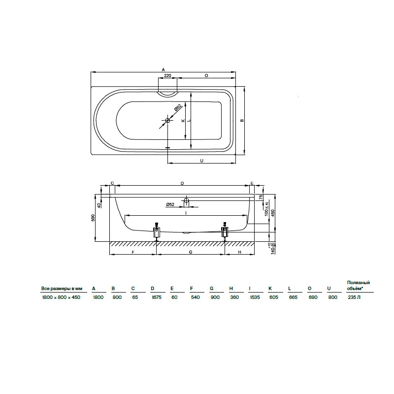 BETTEOCEAN ванна встраиваемая, сторона ног справа, перелив сзади 180x80x45Н см, цвет - белый, BetteGlaze Plus - самоочищающееся покрытие
