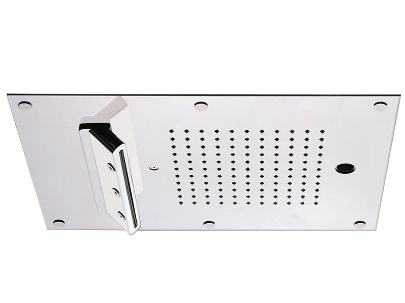 CARIMALI MYDREAM Quadro 23079X Верхний душ потолочный, многофункциональный, скрытого монтажа. Размер 450X300 mm. Хромотерапия, 1 направленный светильник RGB-светодиоды. Распыленная струя с 121 отверстиями. Водяная пыль 1 струя, водопад с регулируемой струей 4. Система легкой очистки, силиконовые отверстия с защитой от известкового налета. С возможностью проверки и техобслуживания. , 1 сменный картридж. Минимальный расход 10 лит/ мин., ограничитель напора на 1 кв.бар. Цвет Хром