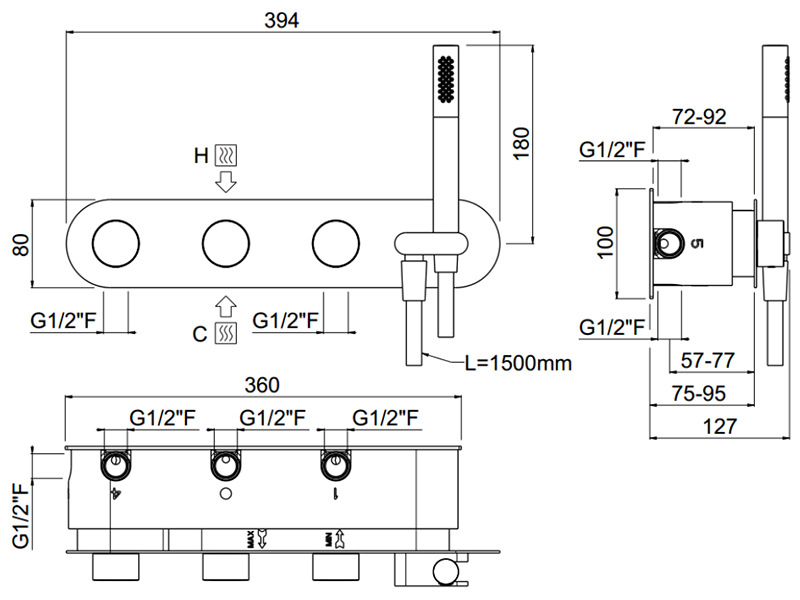 Внутренняя часть встраиваемого смесителя на 4 выхода c держателем для душа, цвет хром