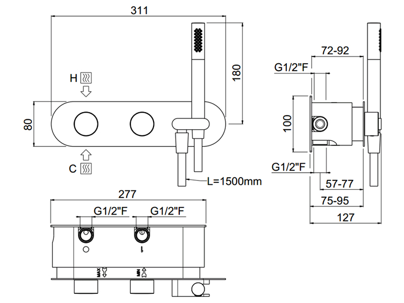 Внутренняя часть встраиваемого прогрессивного смесителя на 3 выхода c держателем для душа, цвет хром