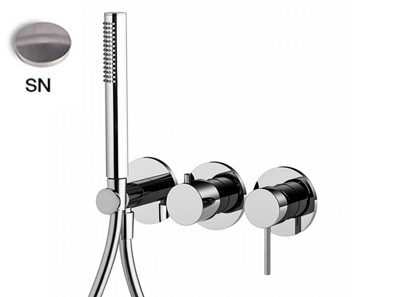 Встроенный смеситель для душа FIMA CARLO FRATTINI SPILLO UP F3049WX8SN на 2 источника с душевым комплектом, только внешняя часть: настенный кронштейн с водоснабжением, ручной душ ABS с защитой от извести анти-кальк, гибкий шланг хромалюкс 1500 мм, внутренняя часть арт. F3400W заказывается отдельно, цвет никель брашированный.