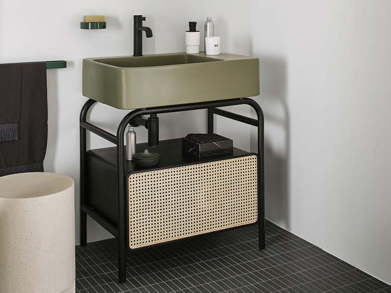 ясеня, фасад из венской соломы. Отделка в цвете Frassino tinto nero - крашенный черный. Размеры: 65 x 50 x h33 см. Структуру MASTE и ящик необходимо обязательно заказывать в одинаковых цветах.