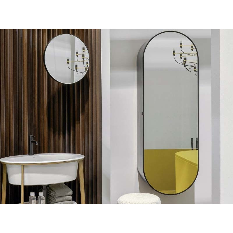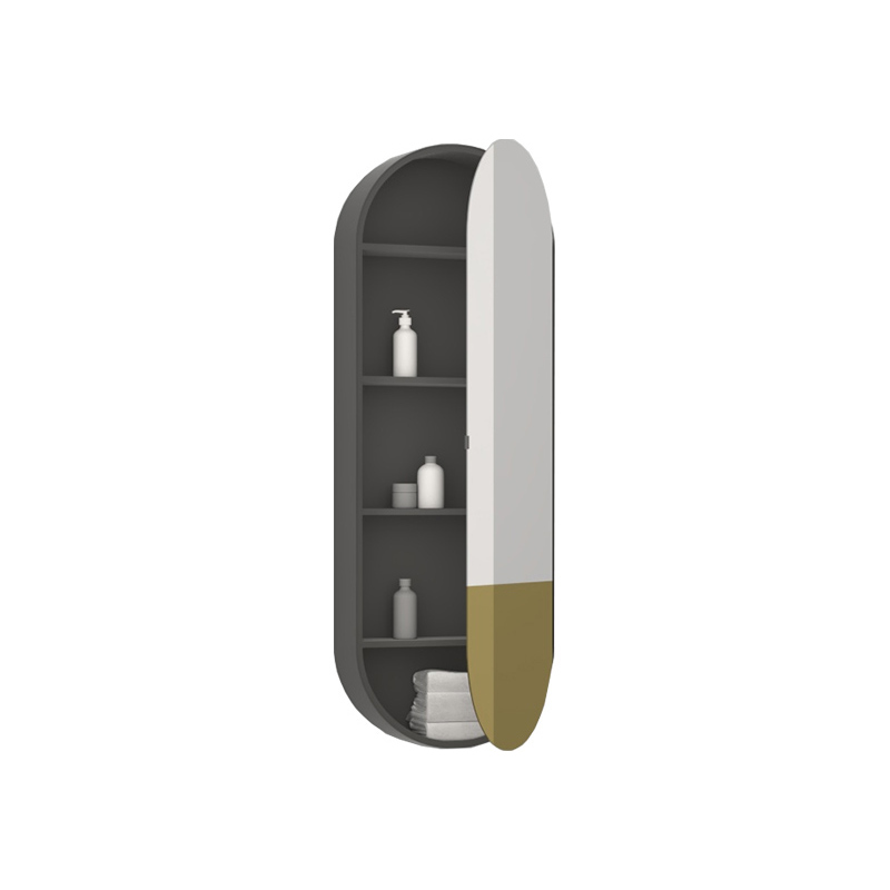 CIELO SPELSCLDX OC ELIO Зеркальный шкафчик овальной формы для ванной комнаты с лакированным корпусом серого цвета. Зеркальная дверь из двухцветного зеркала, нижняя часть в цвете Gold (зеркальное золото). Деревянные полки. Открывание боковое вправо.