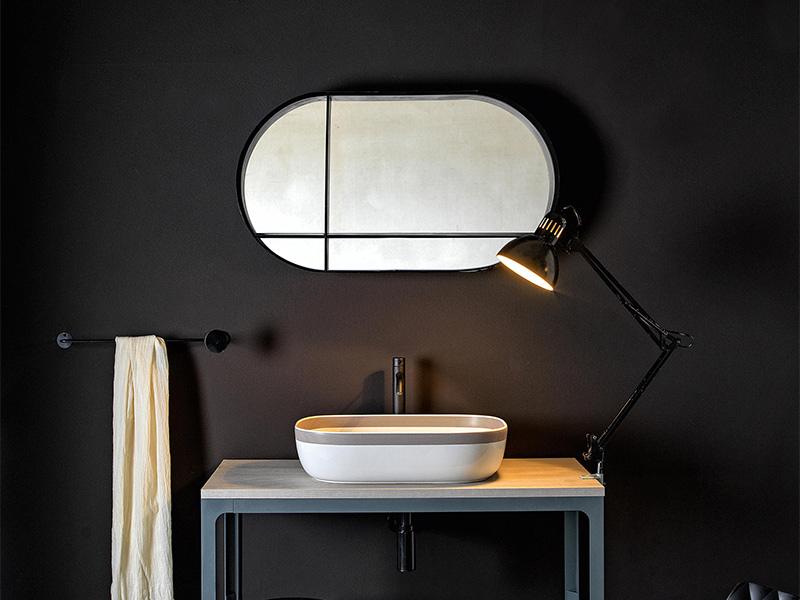Scarabeo ABLE 2404 Зеркало в металлической раме с полками. Зеркало можно устанавливать горизонтально и вертикально. Цвет рамы Matt Black. Размеры: 90 x 50 см. Зеркало представленно в матовом черном и матовом сером цветах.