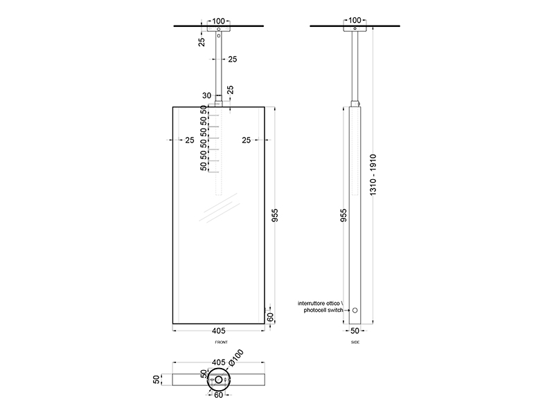 CIELO ARGO ARSP Телескопическое зеркало потолочное с подстветкой и выключателем, с регулируемой штангой 5x5см. Регулировка штанги min 40x130, max 40x190. Размер зеркала без штанги 40x96, Цвет Черный.